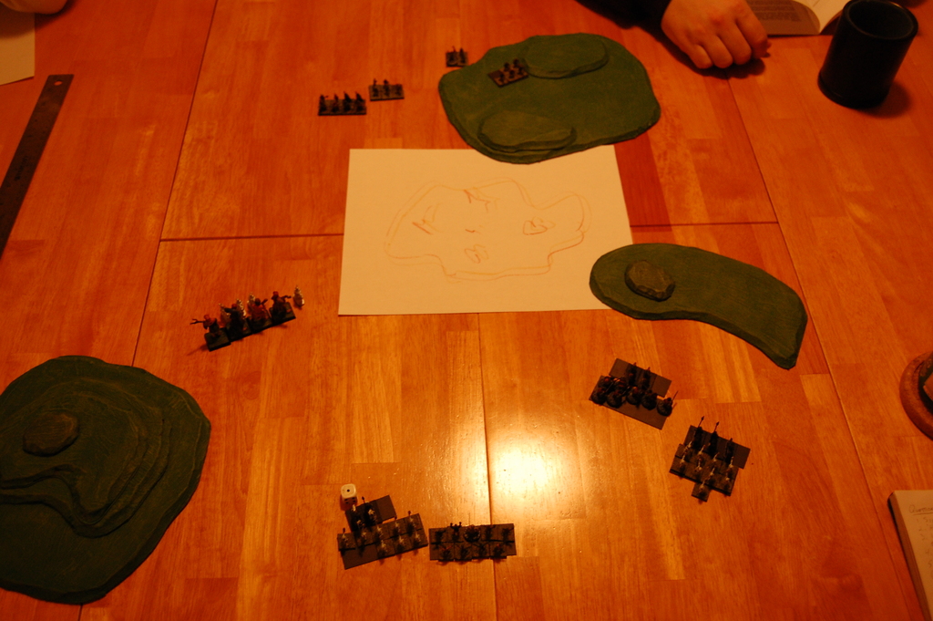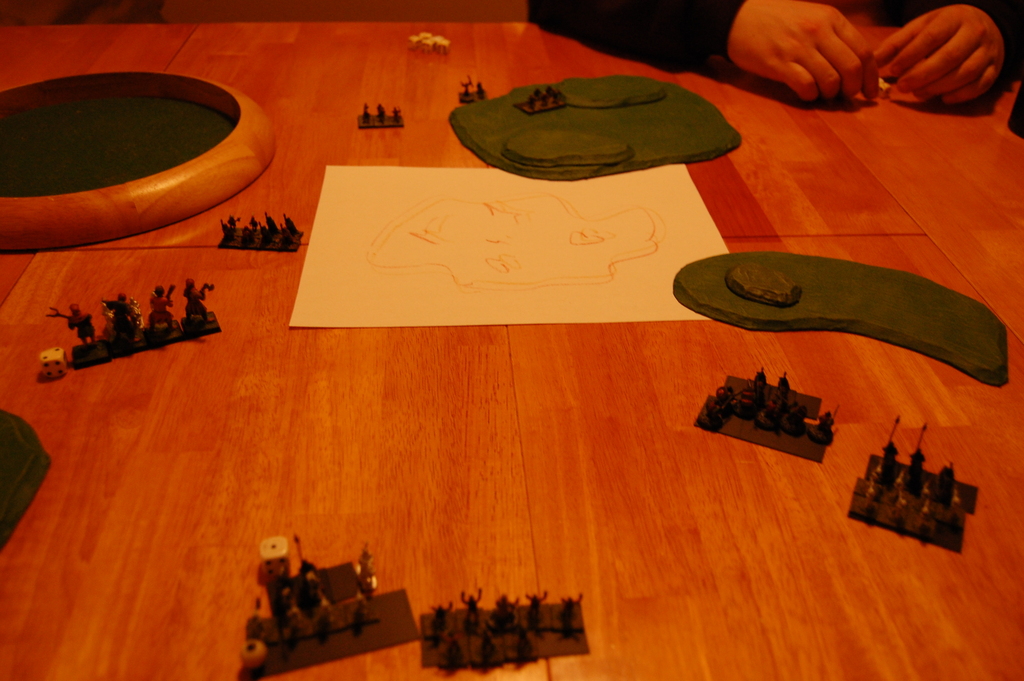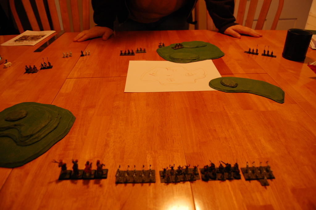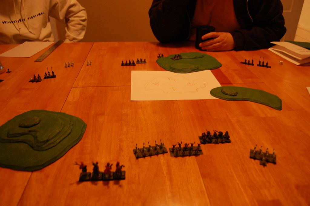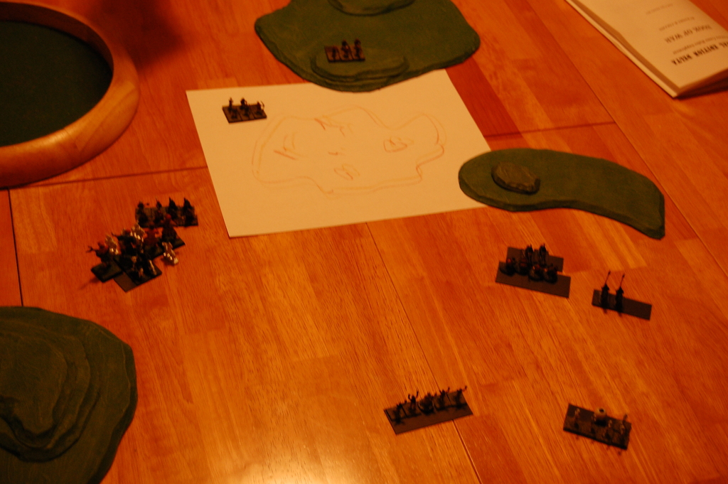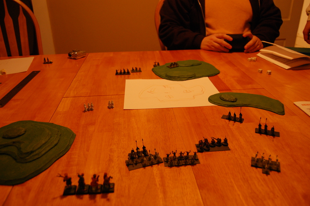 Two players showed up, and for the first game I had them play just using the basic rules, 200 points a piece, just to get a feel for the rules. We actually made a fair number of mistakes along the way, and I took pretty poor pictures of it, so we’ll just skip the review of that game. The major point of interest was that it ended with one player down to just one unit of three horse archers, while the other had two units of cavalry, one medium and one heavy. It was turning into a very slow game of cat and mouse, and so the horse archer player decided to just concede. I think with two units the other guy probably could have eventually cornered those darned horse archers, though it would have taken quite a few turns.