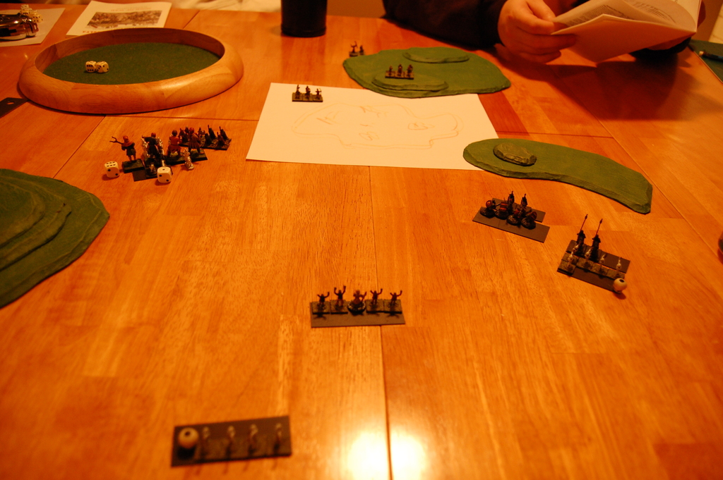Over a year ago I used Delta’s Book of War to resolve a major battle taking place in my campaign: the Battle of Restenford. Next weekend I’ll be doing it again, and for this one the author himself is coming up to help me run it. Expect to see more details on that in the future. I invited some of the players to come and control the defense, which they’re excited to do, but a bit nervous about facing off against the creator of the game. Some practice games were proposed, and so this afternoon I had two guest over for a little Book of War action.